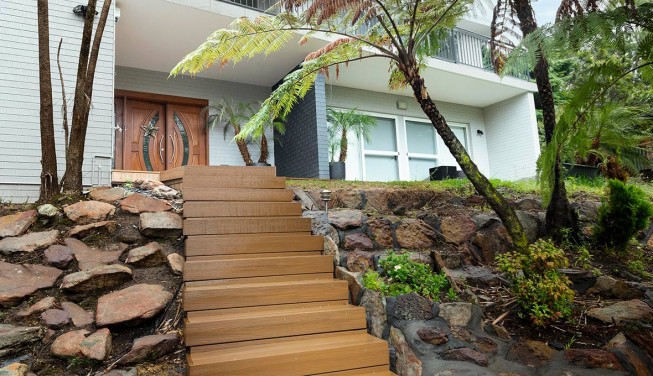 Native trees, plants, and two stone walls flank the boardwalk up to the house, while an understated black rail around the balcony gives the home a contemporary finishing touch.