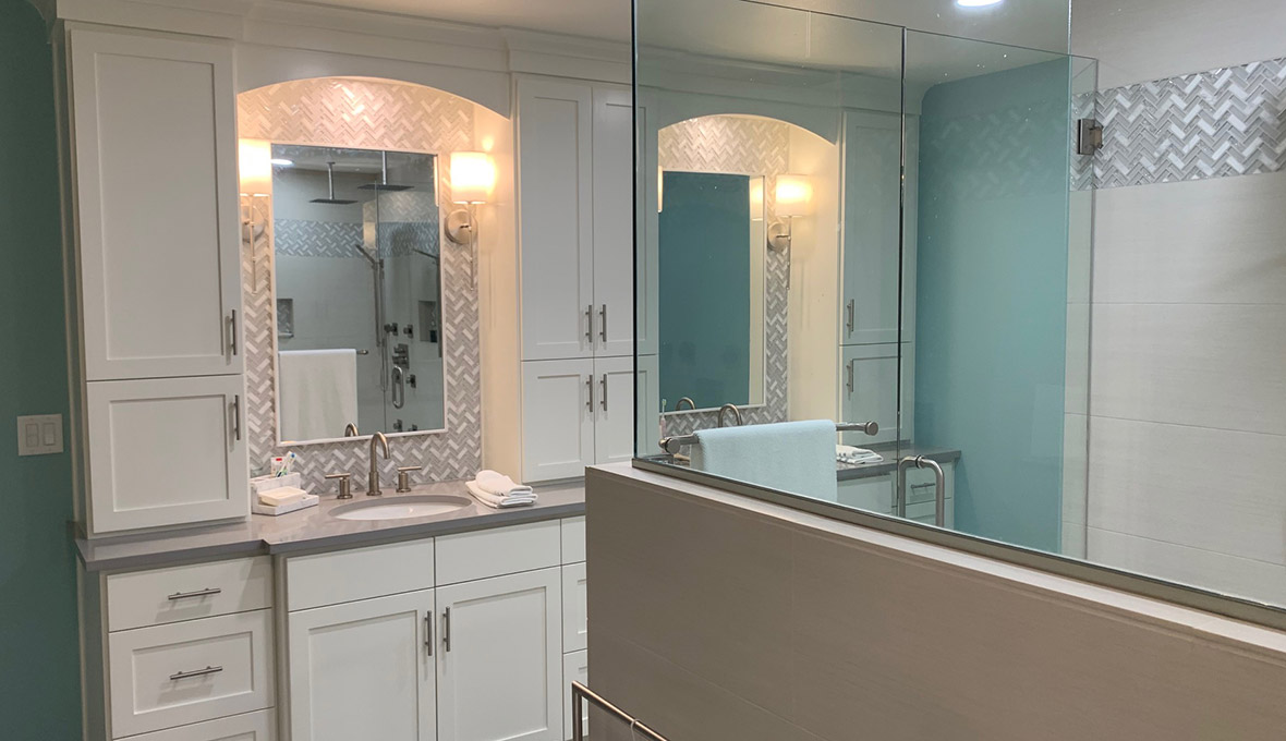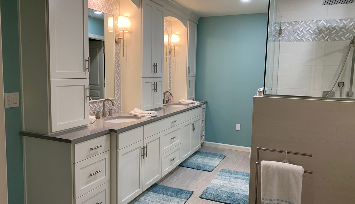 Despite getting rid of one-third of the vanity space, there’s no lack of storage with the remaining double vanity home to sizeable drawers and cabinets. A gray countertop is consistent with the overall color scheme, while herringbone accent tiles are on display behind the mirrors and in the shower. The walls feature their own pop of color, a calming blue chosen to enhance the peace and tranquility of the master bath.