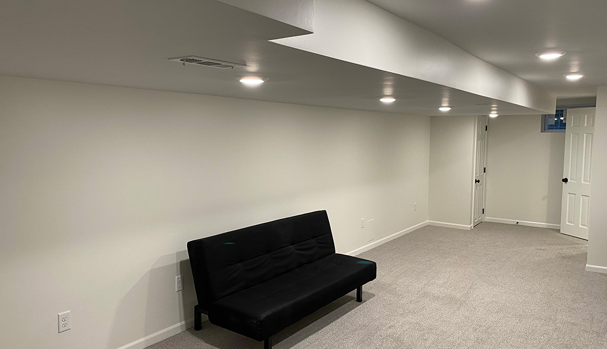 Low ceilings created difficulty, but Troy devised a solution that raised the ceiling height by a few inches. Finishing touches such as the fresh color palette and modern LED disc lights completed the transformation. Now, the basement is not only brighter but also feels larger!