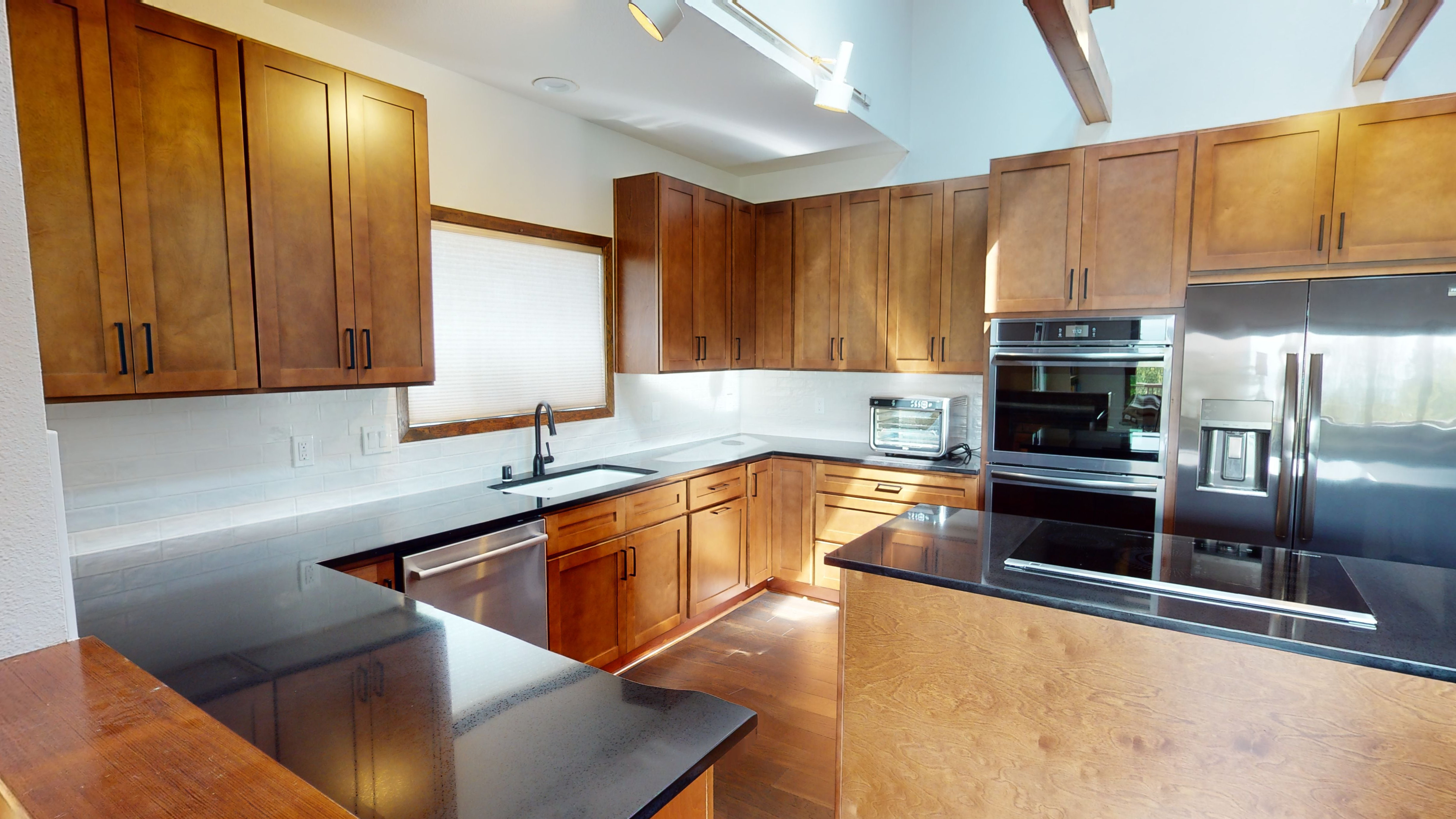 The kitchen layout mostly remained with the same footprint, however the homeowners did want their wall oven moved, to a location that suited their kitchen flow better. New stained wood cabinetry was installed, with classic shaker style doors and matte black hardware handles and pulls, an aesthetically pleasing combination. To tie in new stainless appliances, with matte black features, and the matte black cabinetry hardware sleek black quartz countertops were installed.