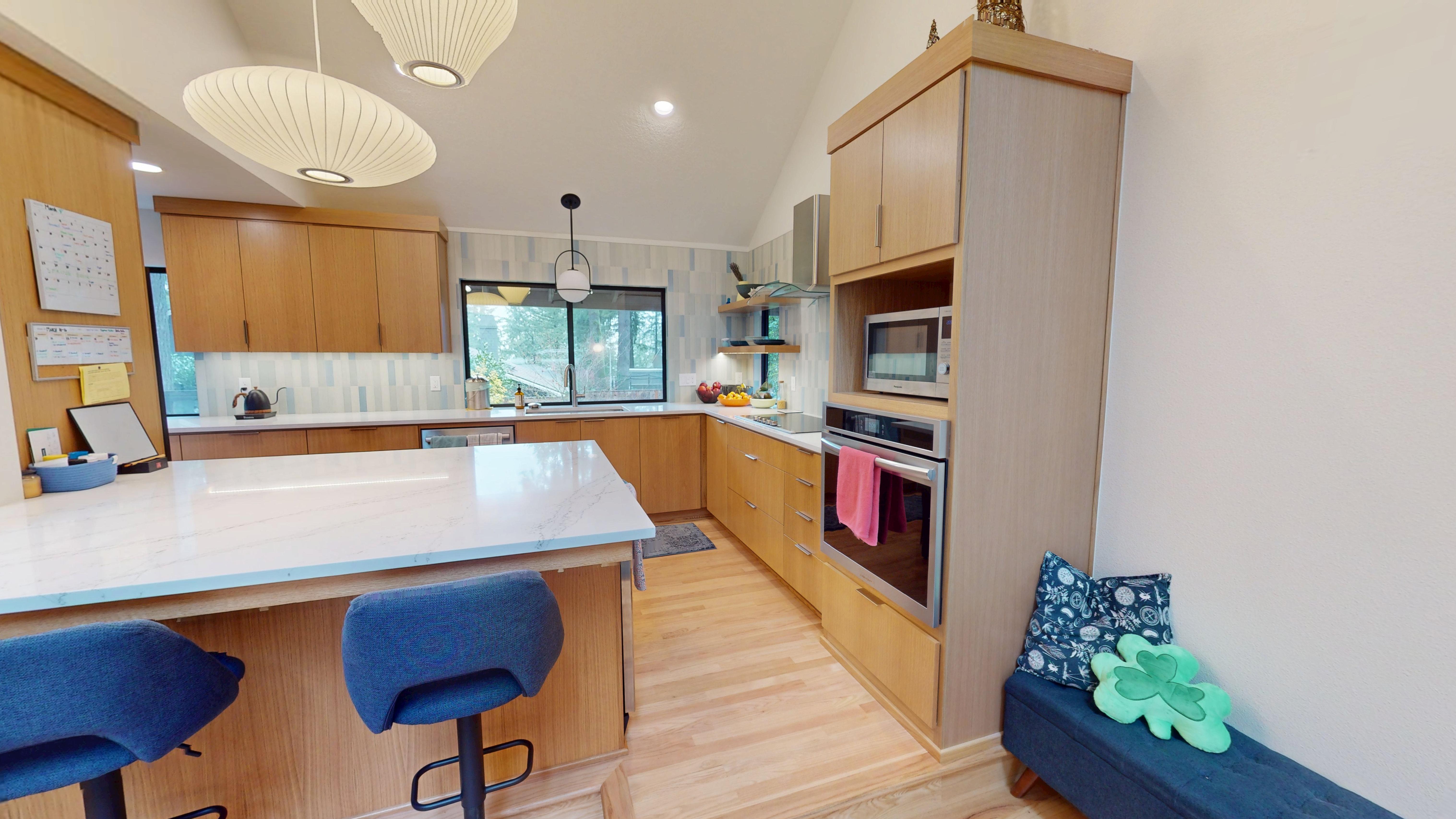 The primary goal of the first-floor remodel was to optimize the use of space. Originally, the house featured two dining rooms, one of which was rarely used. To address this, the homeowners decided to repurpose the underutilized dining room to expand the kitchen, effectively doubling its size. The existing kitchen was completely demolished to make way for the new design. A wall was removed to create an open and seamless flow between the kitchen and the former second dining room. The new kitchen was outfitted with all-new cabinets, countertops, appliances, plumbing, and light fixtures, giving it a sleek and modern feel.