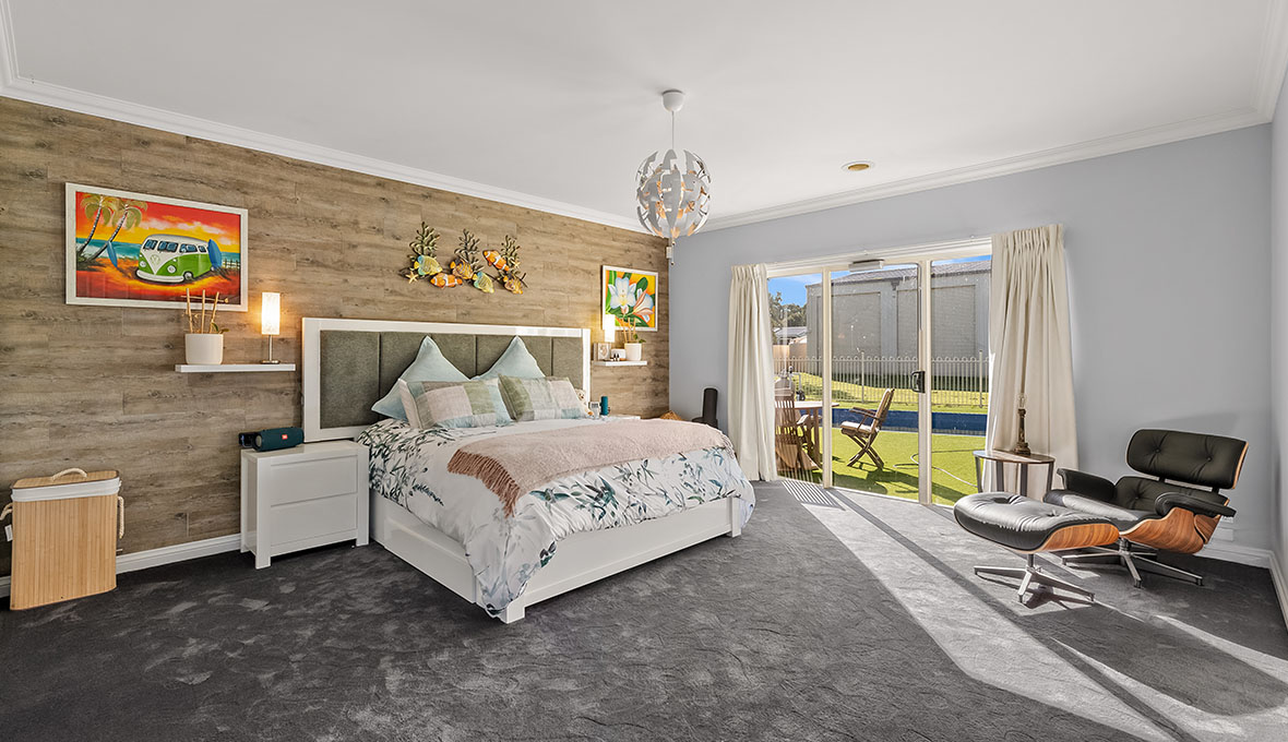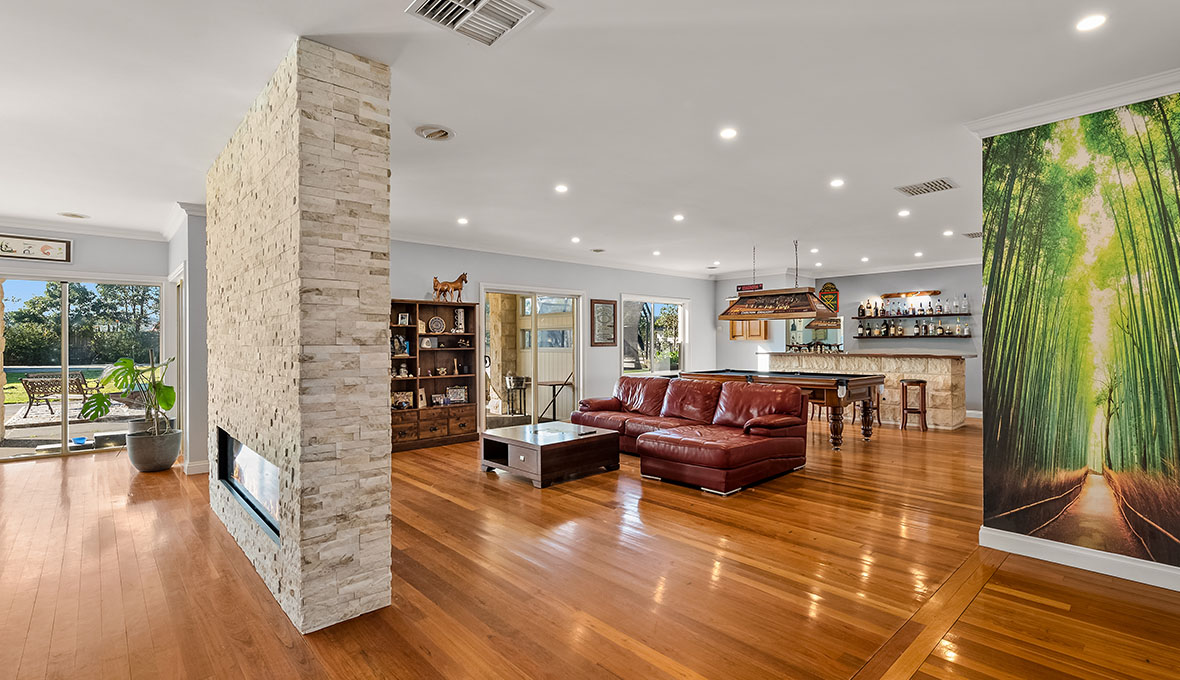 The spacious kitchen with its large island and breakfast bar is a fantastic family hub, with easy access through to the lounge and recreation room. A fireplace wall partially separating the rooms accommodates a gas fire and large in-built television, making the space feel warm and welcoming. Of course, the lounge isn’t the only place to watch a show: an adjoining theatre room takes family movie night to the next level!