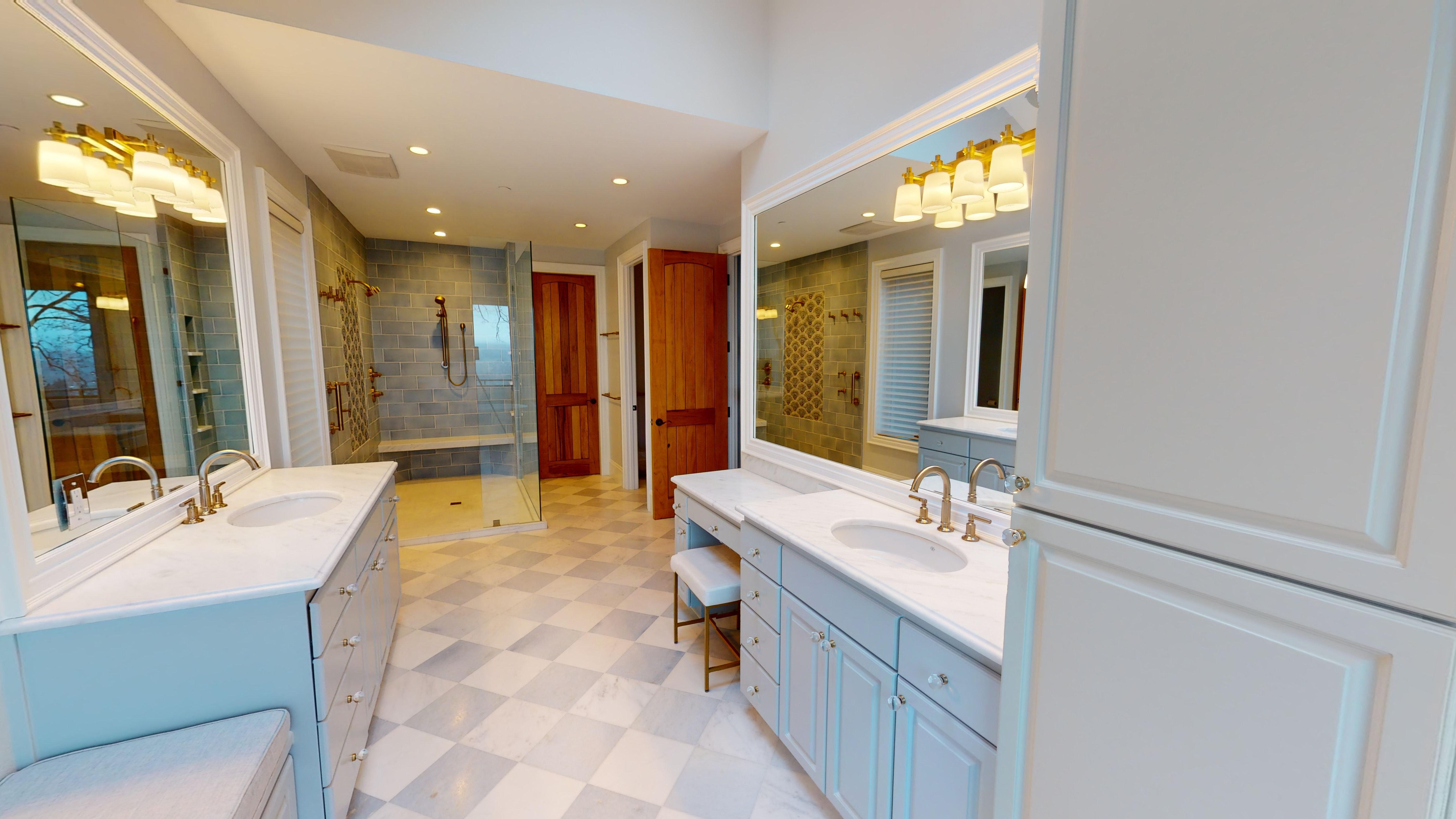Marble, being a natural stone, is an excellent conductor of radiant heating, thus was selected not only for the aesthetics but as a material that efficiently transfers heat from the heating cable to the floor surface. The new, and slightly larger shower, also received marble, with a mosaic insert and marble herringbone pan tile. With a consistent aesthetic in mind, the homeowners also chose marble for the countertops for both rooms.
