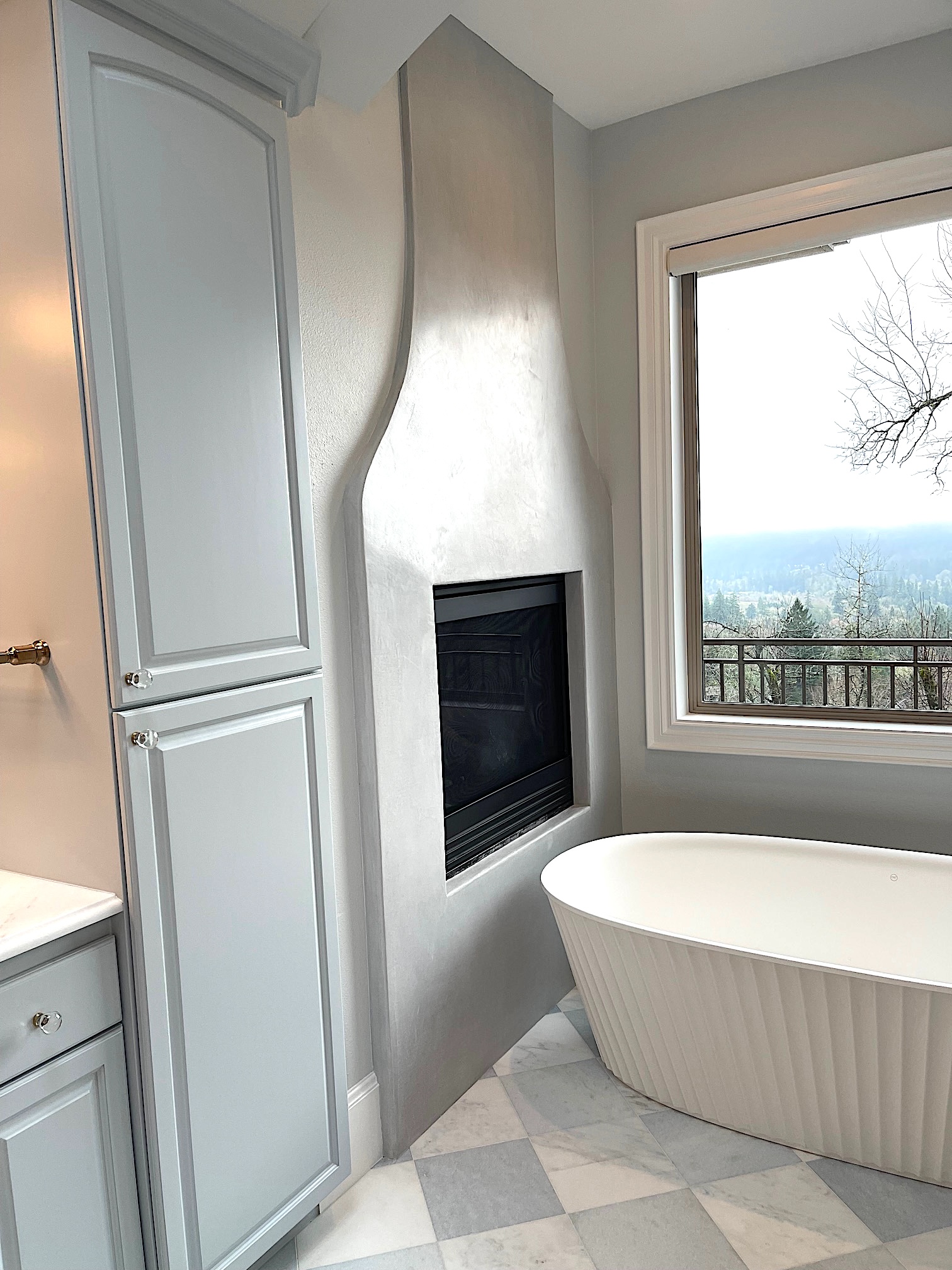 The Refresh team first started with the demo stage of the bathroom and laundry room. As some aspects of the rooms were being re-used, only a partial demo was necessary, which included removing the bathroom and laundry floor (entirely), cabinet countertops, and the fireplace/tub surround.