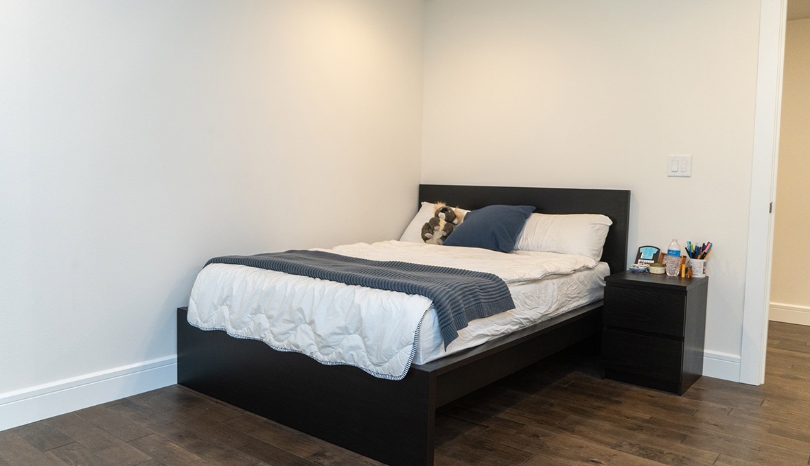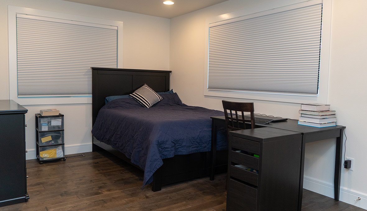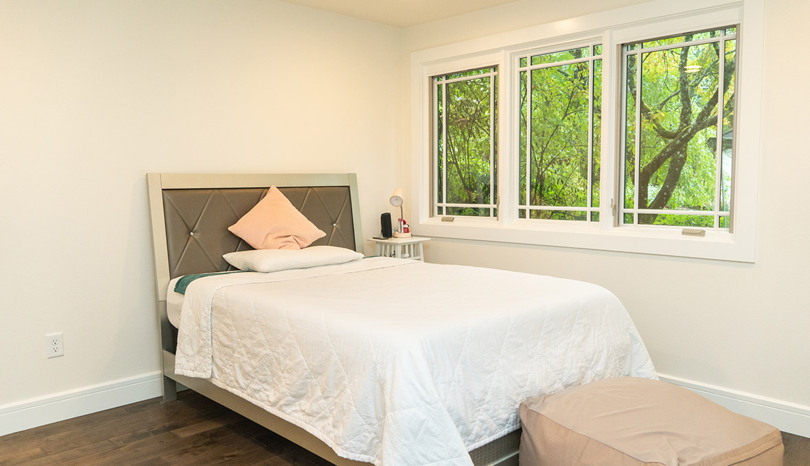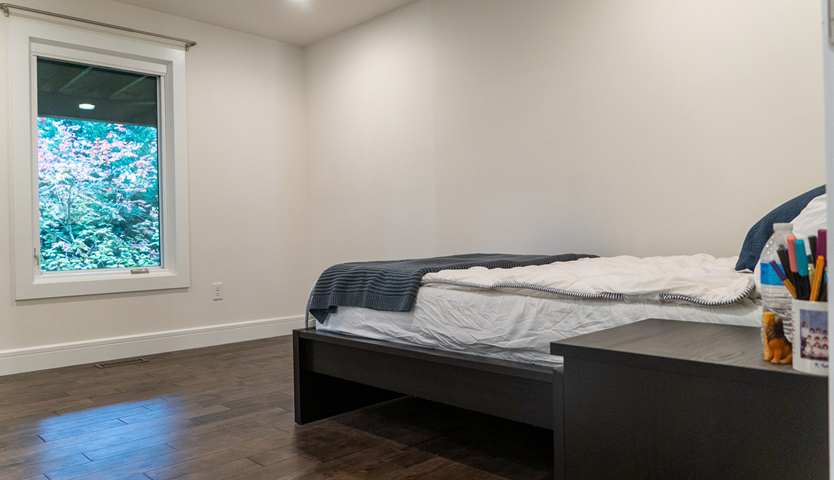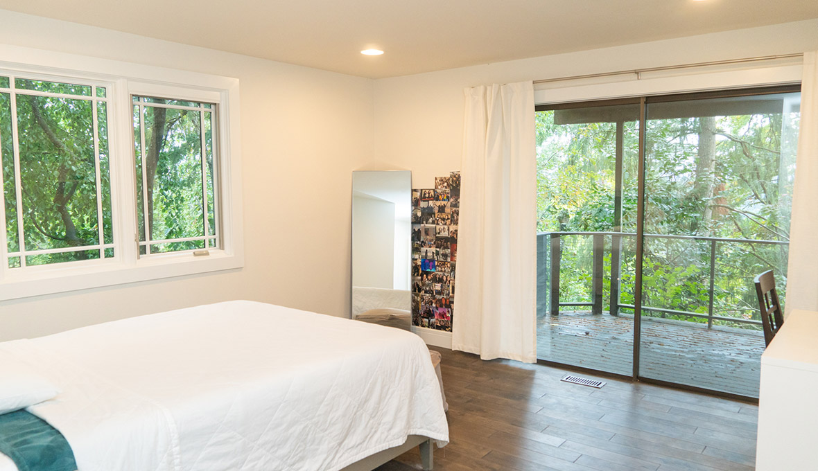 With a spacious and simple design, the four bedrooms feel light and airy, modernized with dark stained wood flooring, pot lighting, and crisp white window framing. What used to be the master bedroom has been converted to a standard bedroom by removing the dated fireplace, creating more space and allowing the lush PNW foliage outside the balcony to be the focal point.