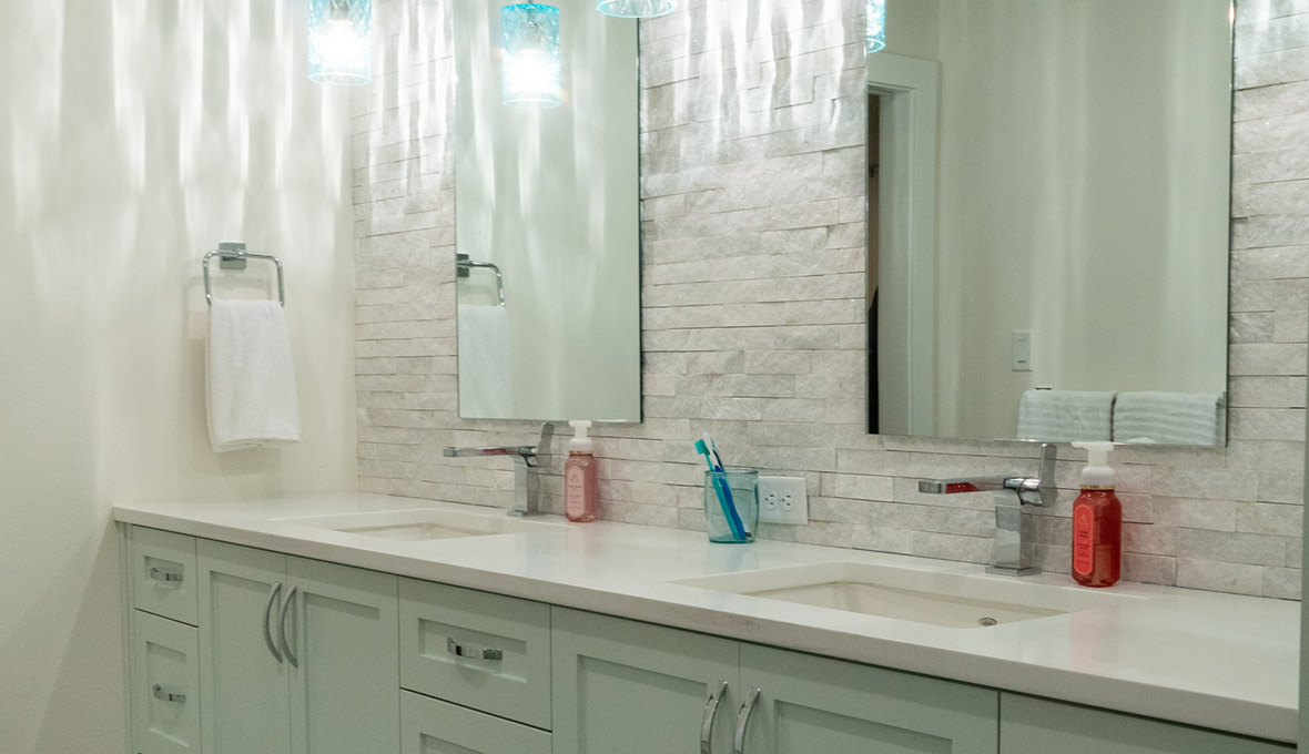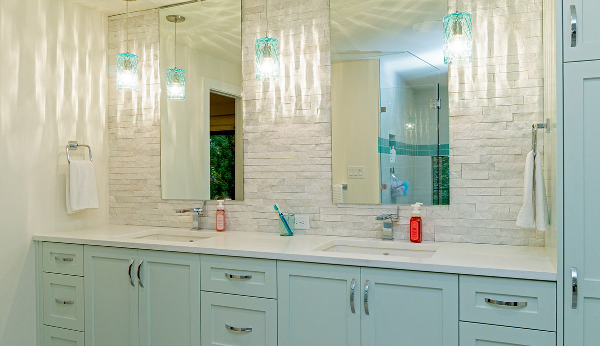 Muted turquoise cabinetry, blue glass pendant lights, and a stone-tiled backsplash that runs from countertop to ceiling behind the double vanities make the Jack and Jill bathroom feel more decorative and fun compared to the chic and understated master bathroom.