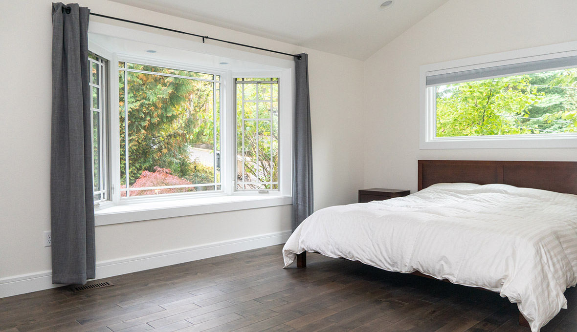 Positioning the master bedroom at the front of the home gives it the original bay window, freshened up with a new white trim. Gone is the domineering built-in book shelving; in its place is an elongated window which lets in natural light and gives the new master bedroom an open and restful ambience.
