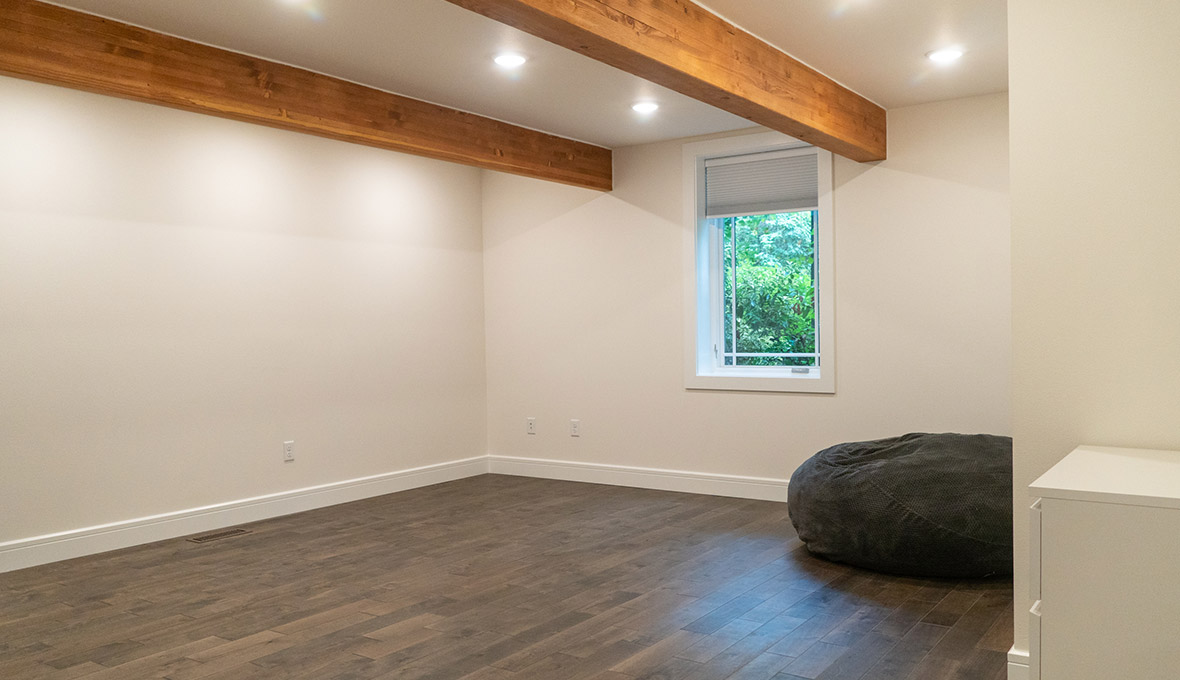 Downstairs, the office and previous guest bedroom have been combined to give the homeowner a flexible room to use how he wants. Well-lit with numerous pot lights and two massive timber beams spanning the length of the room, it could double as guest bedroom, office or hobby room.