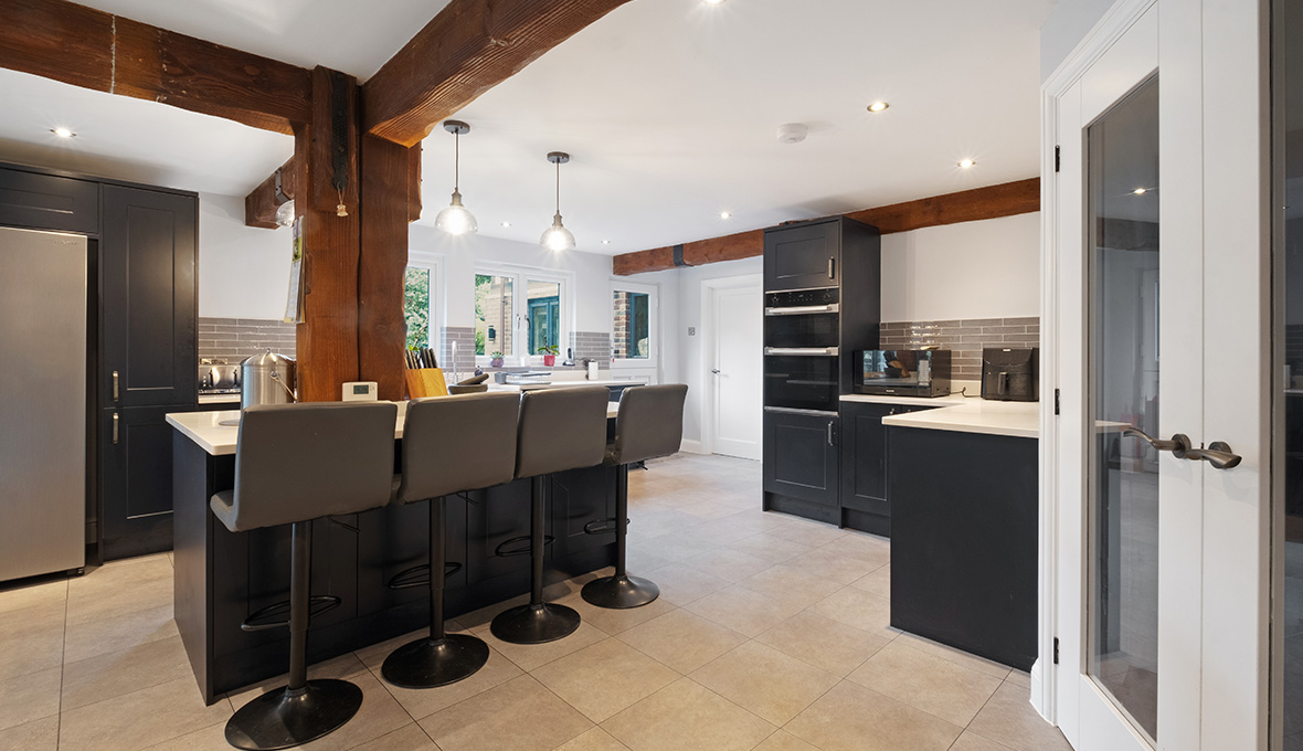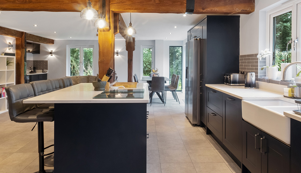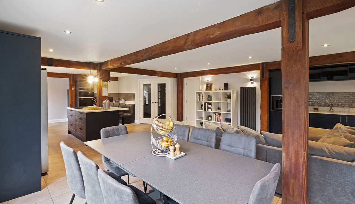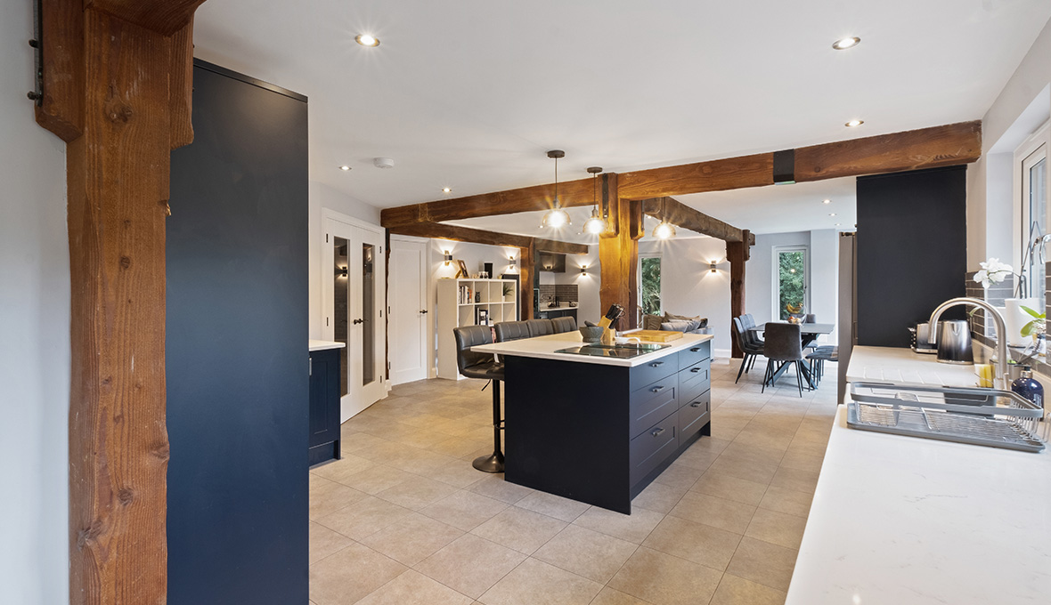 Katherine’s top priority was to create an open plan kitchen, dining, and entertaining area. To achieve this Tracy and Roger’s design team created a concept that would demolish the original kitchen, knock out walls, and create the space needed for a large family hub that would be light and bright. The design would be contemporary but pay homage to the traditional features of the property by highlighting wooden beams and posts throughout the space, and by installing a shaker style kitchen. With a busy family, the space needed to look good while being low maintenance!