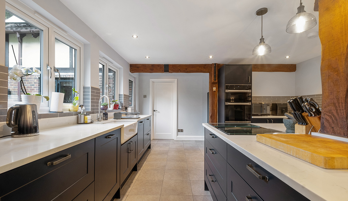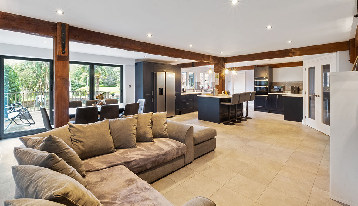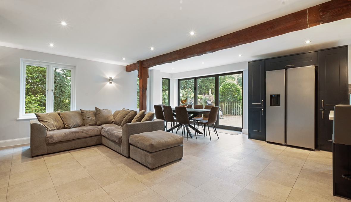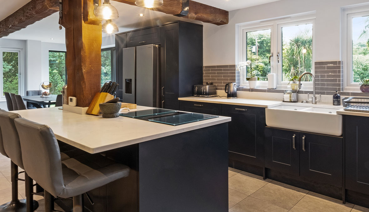 Katherine’s top priority was to create an open plan kitchen, dining, and entertaining area. To achieve this Tracy and Roger’s design team created a concept that would demolish the original kitchen, knock out walls, and create the space needed for a large family hub that would be light and bright. The design would be contemporary but pay homage to the traditional features of the property by highlighting wooden beams and posts throughout the space, and by installing a shaker style kitchen. With a busy family, the space needed to look good while being low maintenance!