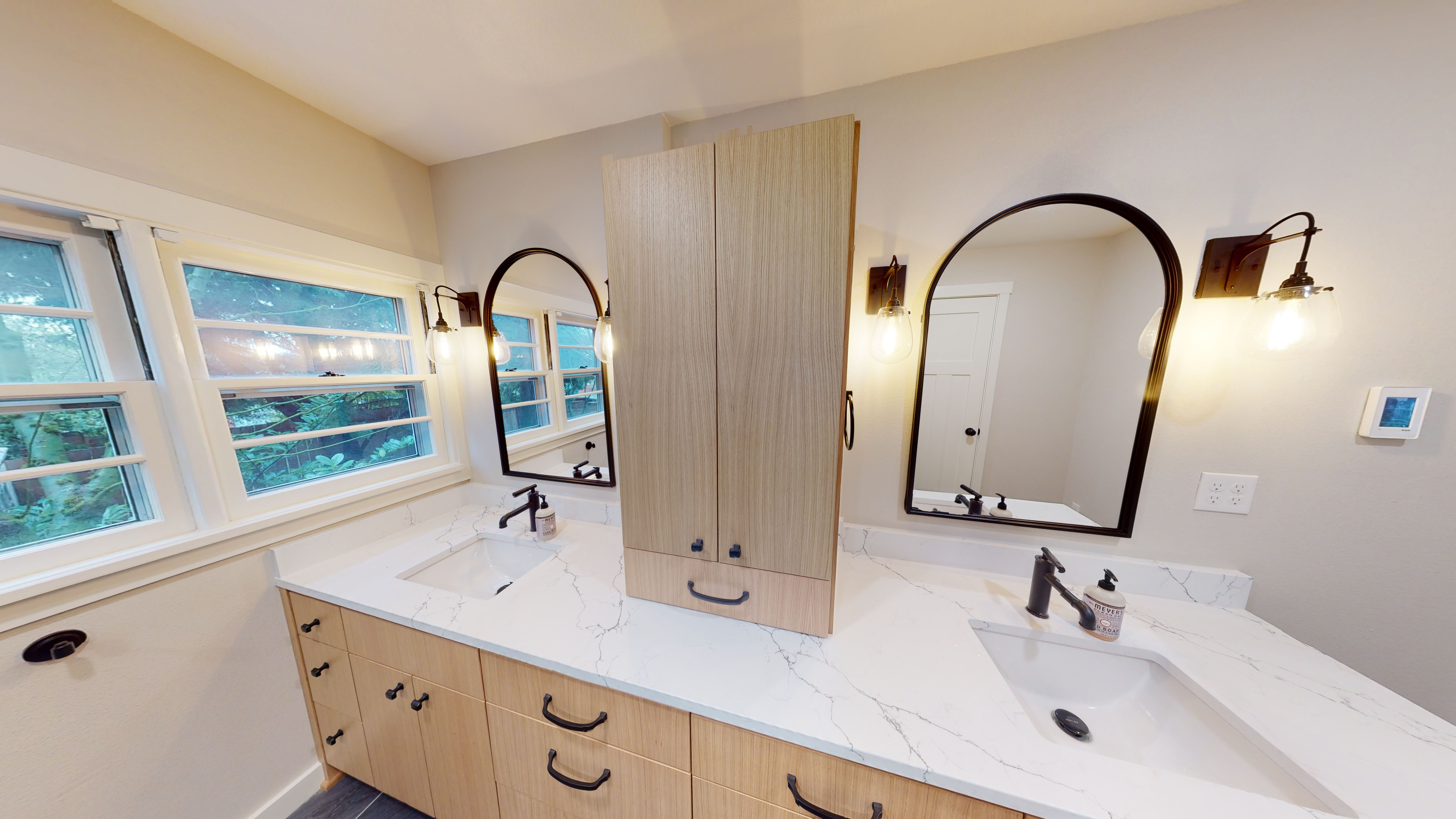 The bathroom expanded into the hallway to make room for a larger shower and vanity. Like the kitchen, this space received a full make-over! The original layout of the space was slightly changed to make room for a larger vanity and walk-in shower, which was accomplished by moving the location of the toilet. The bathroom now features a spacious tiled walk-in shower, with not 1 but 2 shower heads, a glorious double vanity with lots of drawers and cupboard space, plus a stunning countertop and backsplash. This space also received new lighting and flooring fit for the new modern flair of the space.