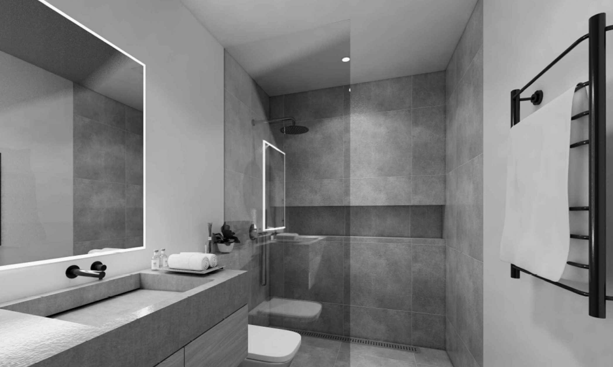 Clean Lines: The tiles were laid in a precise, grid-like pattern to ensure that vertical and horizontal lines were uninterrupted. The vanity and shower were designed with straight, clean lines and handleless drawers.