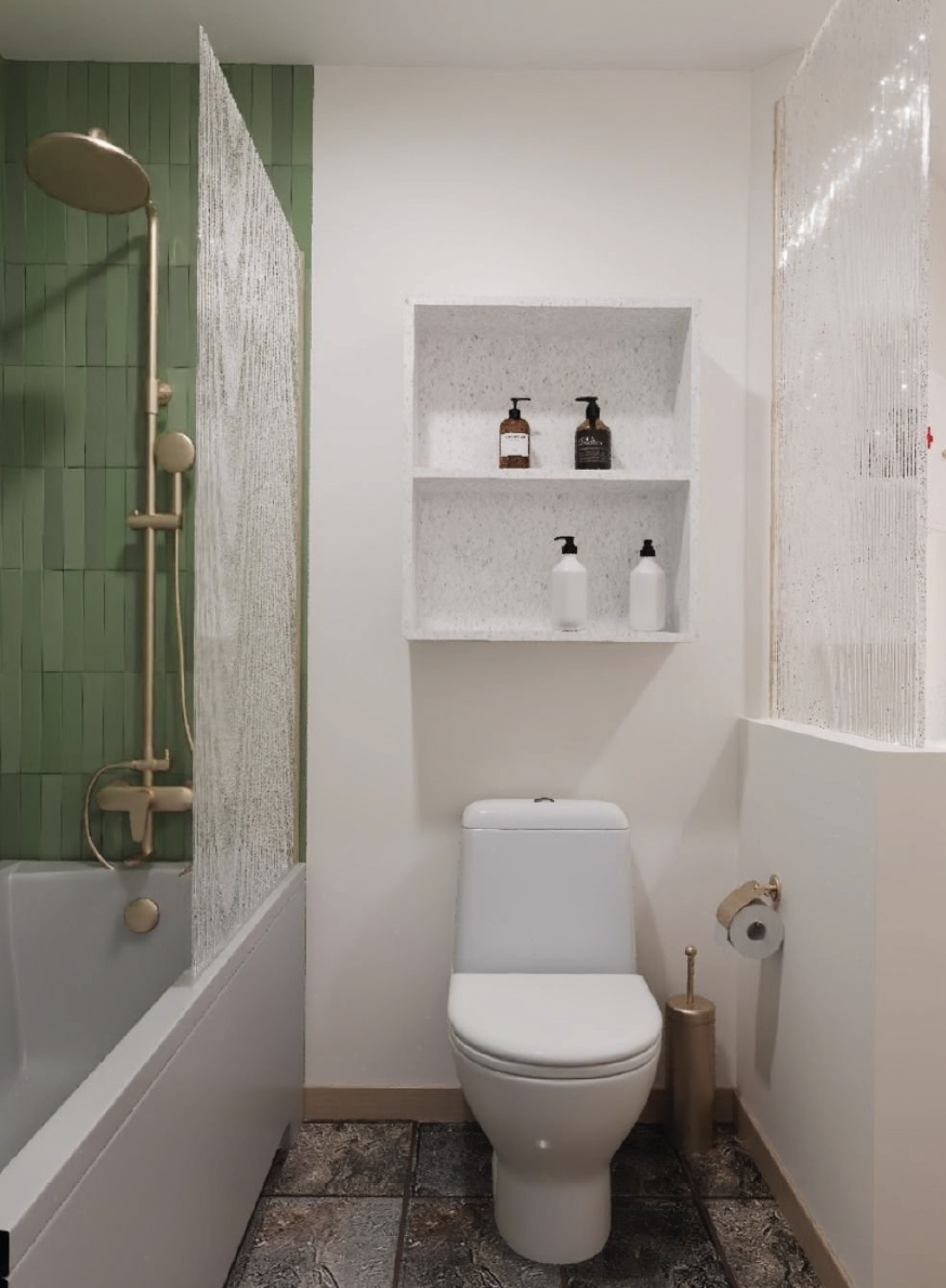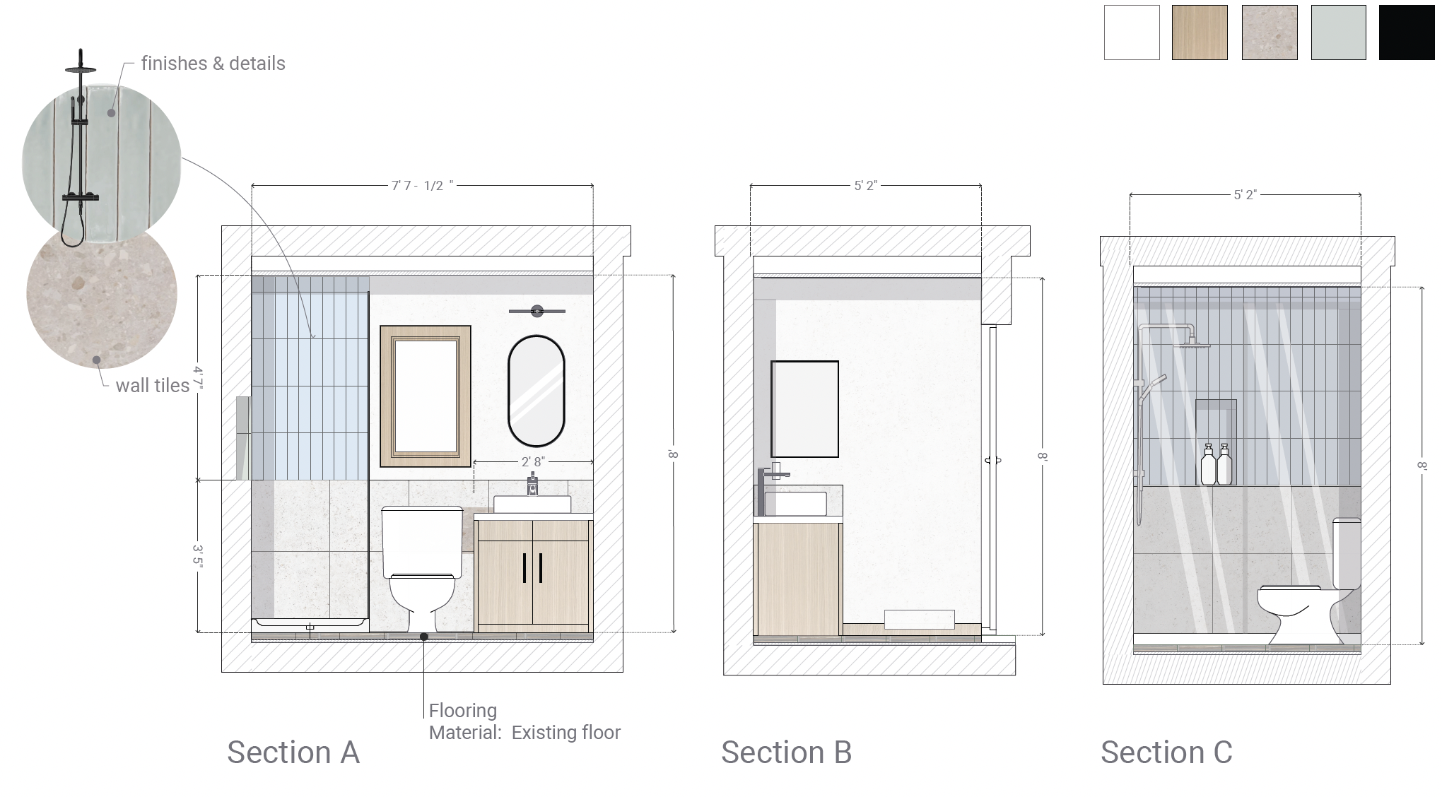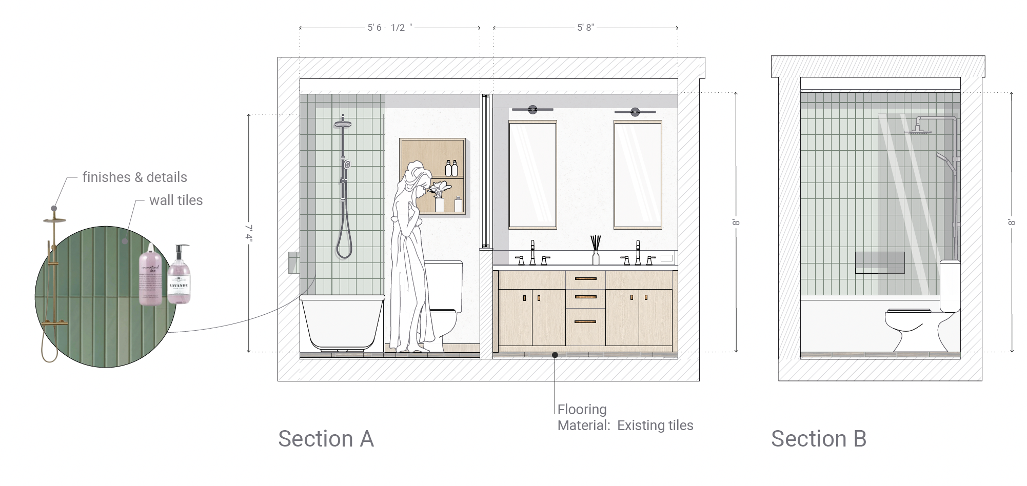Color Scheme: The walls were planned to be painted in a soft, muted green to match the first bathroom.