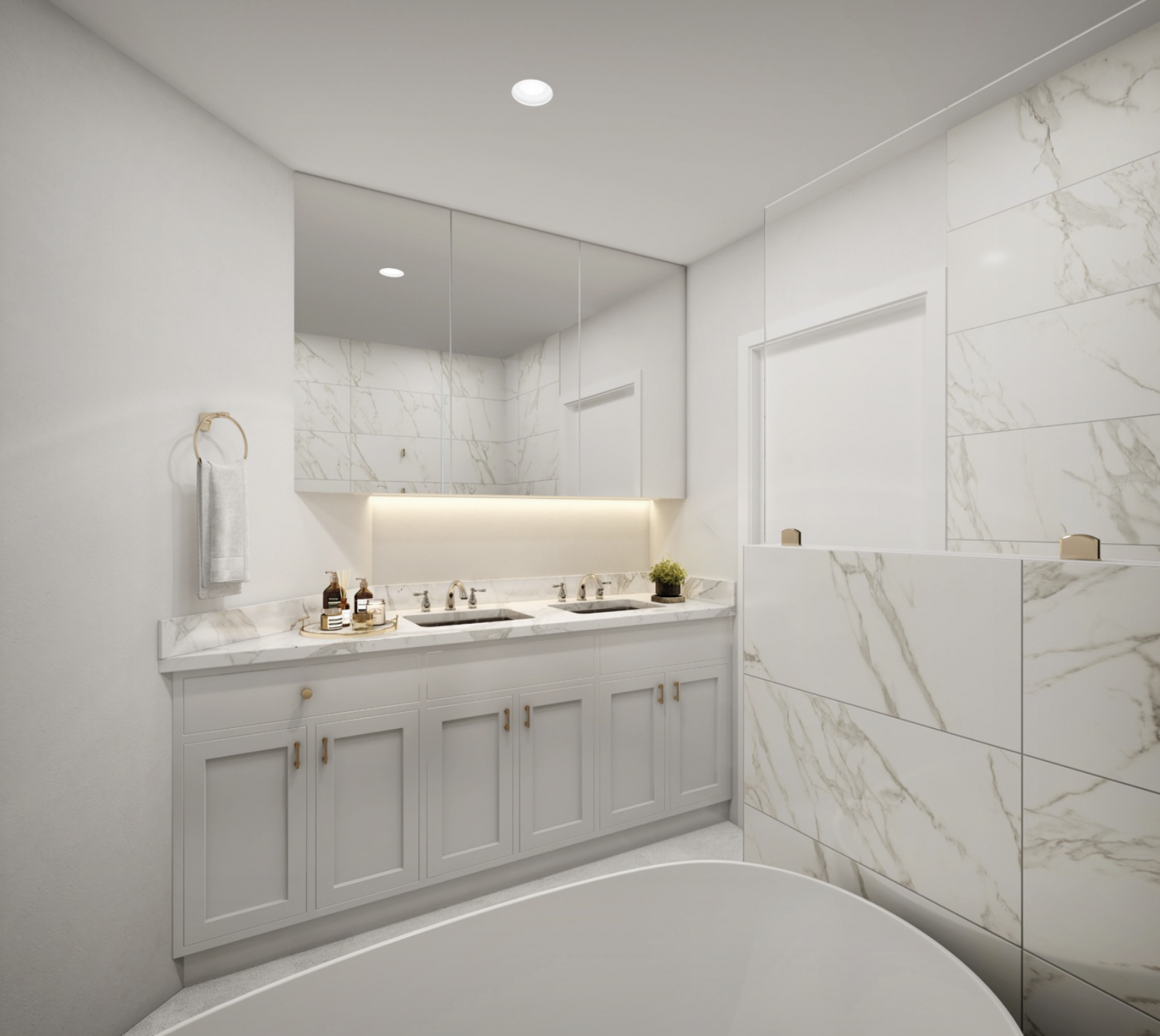 A custom-built vanity with ample drawer space to be installed to keep the countertops clutter-free.