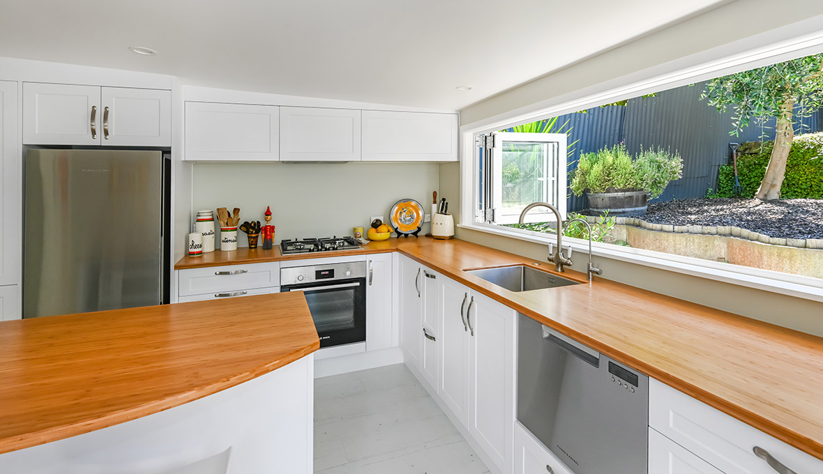 Bamboo benchtops, antique-inspired fixtures, and seamless flow from the kitchen to patio caught the eye of voters and earned Renovation Consultants Sophie Roydhouse-Ross and Mike Ross third place for their transformation of a Hospital Hill cottage.